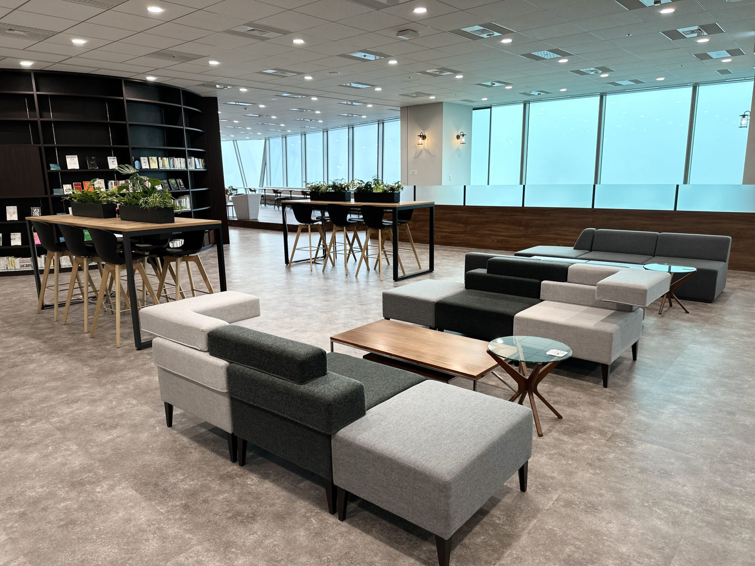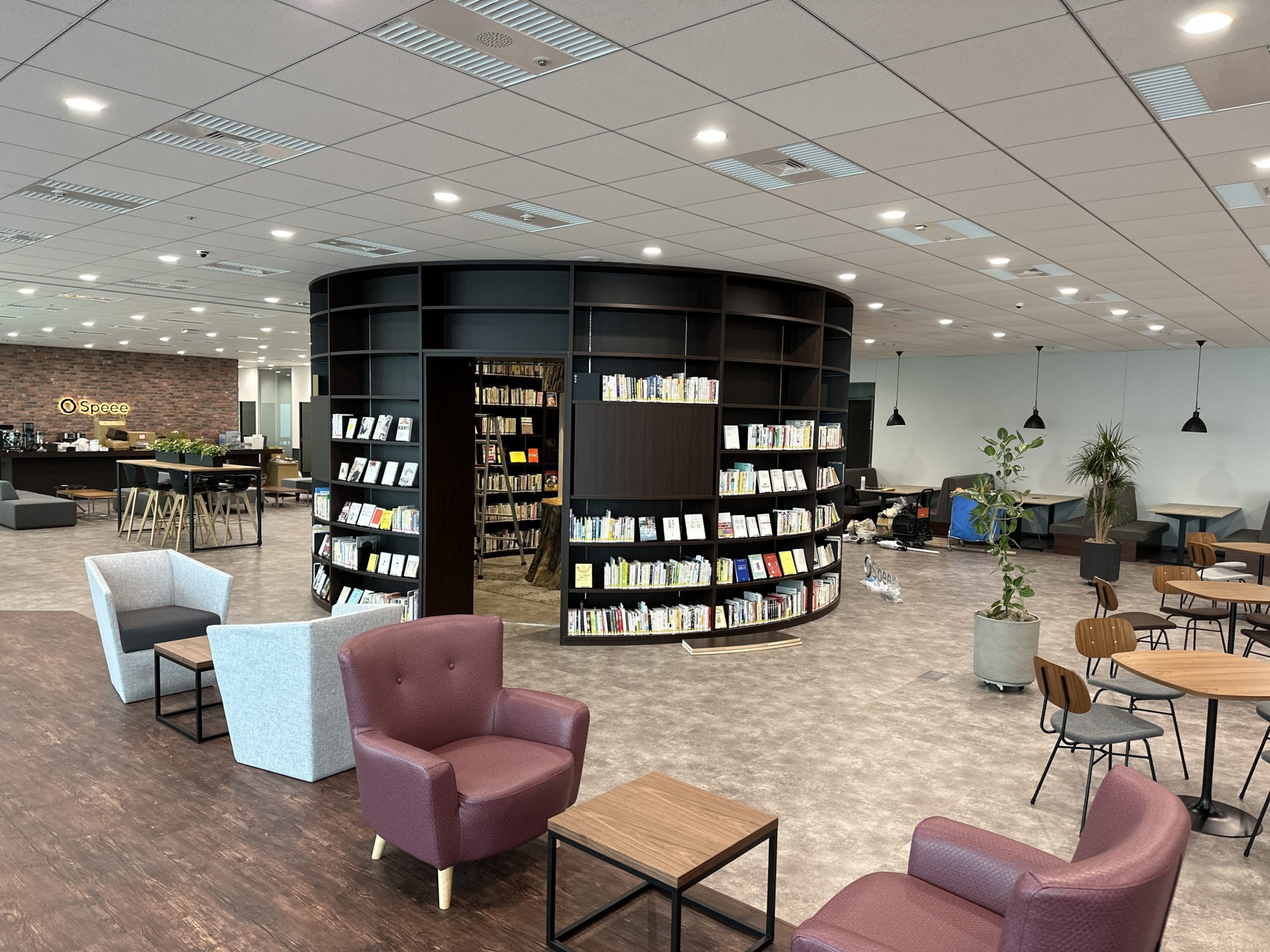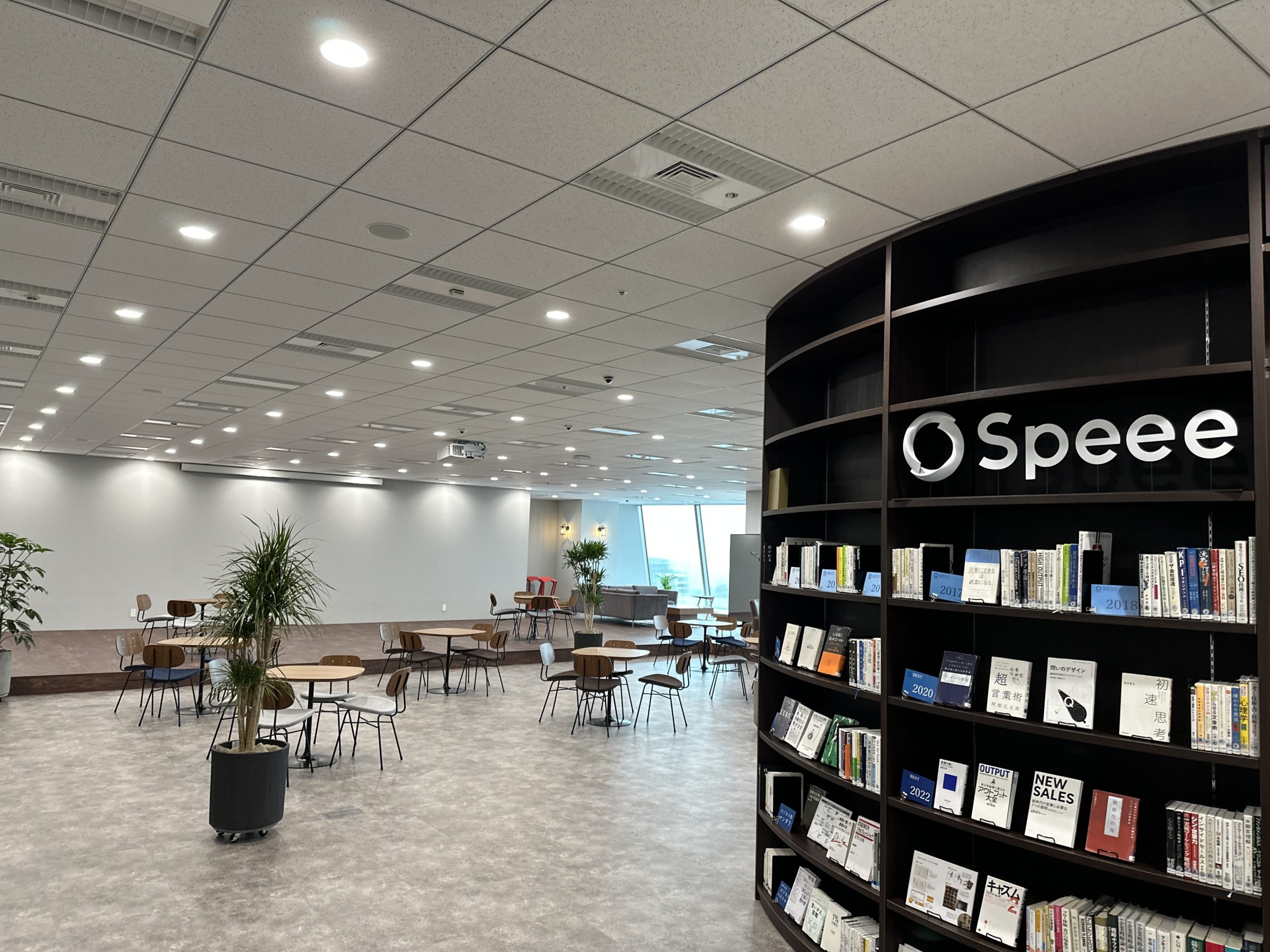 本プロジェクトは、社員数増加に伴った移転ということで、子会社も含めた全事業部を六本木グランドタワーに集約させました。デザインの主軸は「UP GRADE」。以前のオフィスのテイストは残しつつ、よりラグジュアリーな要素をプラスした空間を作り上げました。 社内外の憩いの場であるラウンジ中央には、アイキャッチとなる直径5mのSpeeeロゴを模した円形本棚を配置しています。